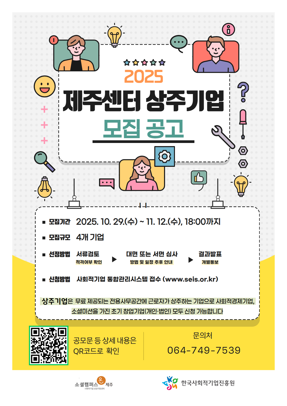 한국사회적기업진흥원은 우리 사회의 다양하고 혁신적인 사회적기업을 육성하기 위해 사회적기업 성장지원센터를 운영하고 있으며, 다음과 같이 성장지원센터(소셜캠퍼스 온 제주)에 상주할 기업을 모집하오니 많은 관심과 참여 바랍니다.